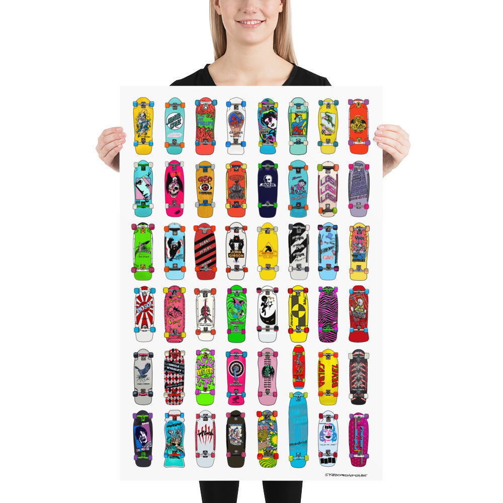 This poster is a collection of 48 classic complete skateboards assembled and hand-drawn, by me. Bernie.
