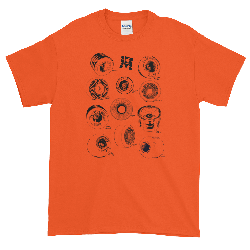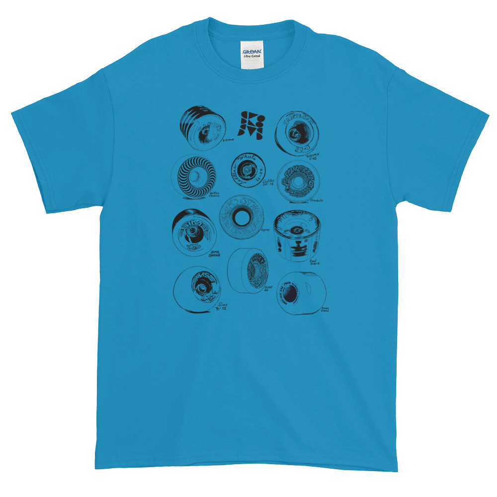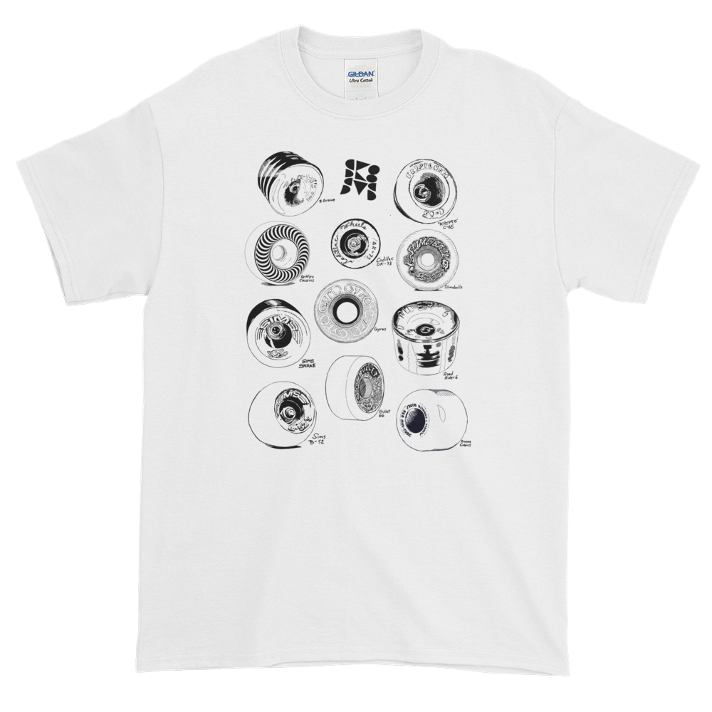 Hand drawn iconic skateboard wheels from the seventies and eighties. Support the little guy with this custom made, graphic tee from our DIY brand. This shirt is designed and made locally in Los Angeles by skaters for skaters.